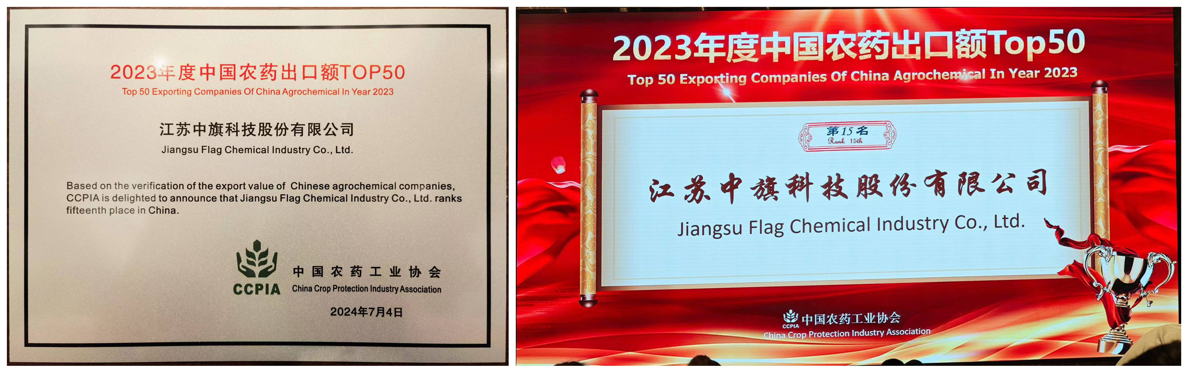2024年7月4日,在“第十一屆中國(guó)植物保護(hù)產(chǎn)品國(guó)際貿(mào)易發(fā)展論壇”上,中國(guó)農(nóng)藥工業(yè)協(xié)會(huì)發(fā)布2023年度“中國(guó)農(nóng)藥出口額Top50”榜單,中旗科技榮獲該榜單第15名。